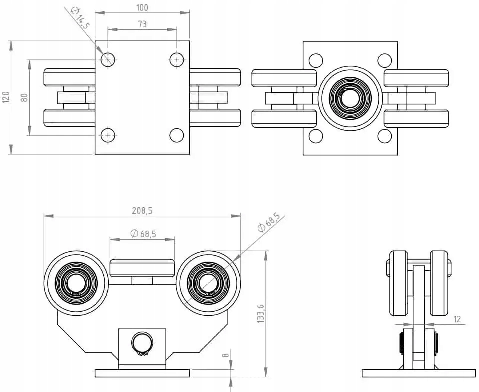 Тележка МАЛЕНЬКАЯ БАЗОВАЯ для ворот, 5 роликов, распашная, профиль 80х80 мм, до 800 кг, сталь