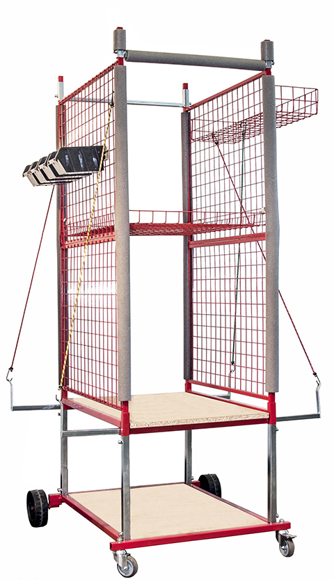 Тележка для хранения и транспортировки кузовных деталей, при разборке автомобиля в процессе покраски автомобиля. Он позволяет хранить такие элементы кузова, как крышки двигателя, крышки багажника, двери, колеса, патрубки и элементы выхлопной системы, а также множество других съемных элементов кузова и оборудования автомобиля. Разнообразие используемых полок и дополнительных контейнеров предотвращает потерю мелких и необычных элементов, а также позволяет точно приписать их к автомобилю или элементу кузовного оборудования, что позволяет существенно сэкономить рабочее время за счет лучшей организации хранения.