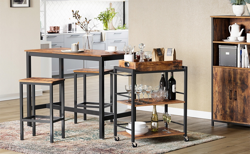Все необходимые для вечеринки закуски, десерты и напитки можно разместить на устойчивых полках сервировочной тележки. Тележка оснащена тремя большими уровнями полок и стальной конструкцией размерами 25 х 25 мм, что обеспечивает максимальную нагрузку до 60 кг.