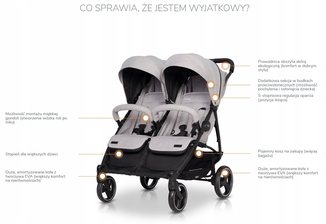Шины колес бескамерные и изготовлены из полиуретана, что делает их исключительно устойчивыми к истиранию и обеспечивает лучшую амортизацию, чем обычные колеса из ЭВА. Стоит отметить, что ширина коляски составляет 72 см, а это значит, что она легко пройдет в большинство дверей. Этого удалось добиться за счет сохранения удобной ширины сиденья благодаря соответствующей форме рамы. Добавляя модные структурные ткани и направляющую, прошитую вручную из экологической кожи, мы получаем одну из самых интересных колясок для близнецов на рынке.