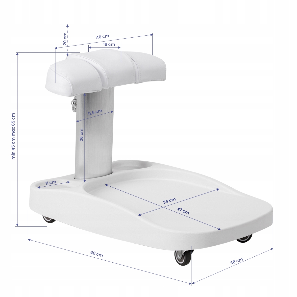 Тележка для душевого поддона Azzurro с регулируемой подставкой для ног является незаменимым оборудованием в кабинетах красоты и ортопедии. Это облегчает повседневную работу, обеспечивая мобильность и порядок на рабочем месте. Это идеальное решение для людей, которые ценят комфорт и эффективность.