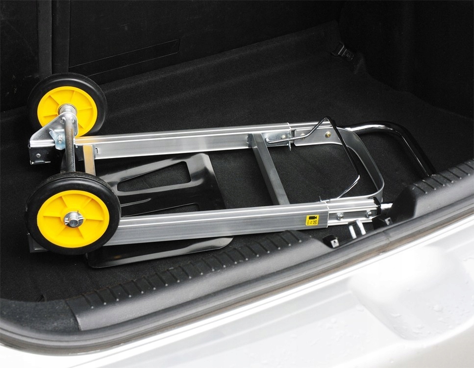 <р> Большая стальная загрузочная платформа размером 355x240 мм позволяет загружать картонные коробки, ящики или контейнеры различных размеров. Благодаря системе быстрого складывания грузовую платформу можно сложить одним движением. Телескопическая ручка с системой блокировки в разложенном виде достигает общей длины 1080 мм, что позволяет осуществлять эргономичную транспортировку без чрезмерных усилий. <р> Кроме того, установленная устойчивая поперечная штанга значительно облегчает подъем груза. <р> Важным преимуществом этой коляски является ее компактный дизайн. В сложенном виде его размеры составляют 190х710х390мм. Благодаря этому его очень легко хранить или транспортировать, и он легко помещается в багажник любого легкового автомобиля. Колеса из ПП+ЭВА диаметром 150 мм устойчивы к истиранию. Однако легкая алюминиевая конструкция весом всего 4,3 кг обеспечивает длительное использование.Данные:
