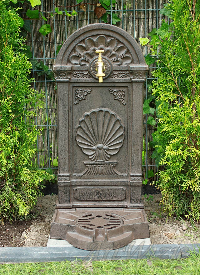 Стоящий носик (раковина) с темно -коричневым краном с раковиной. По раковине, латунном кране ¾ дюйма, столового винта, разъема и решетки решетки на дне. h1> Раковина в нижней части имеет отверстие для дренажа воды. h1> Под краном вы можете заменить стандартное ведро или поливную банку. сад.