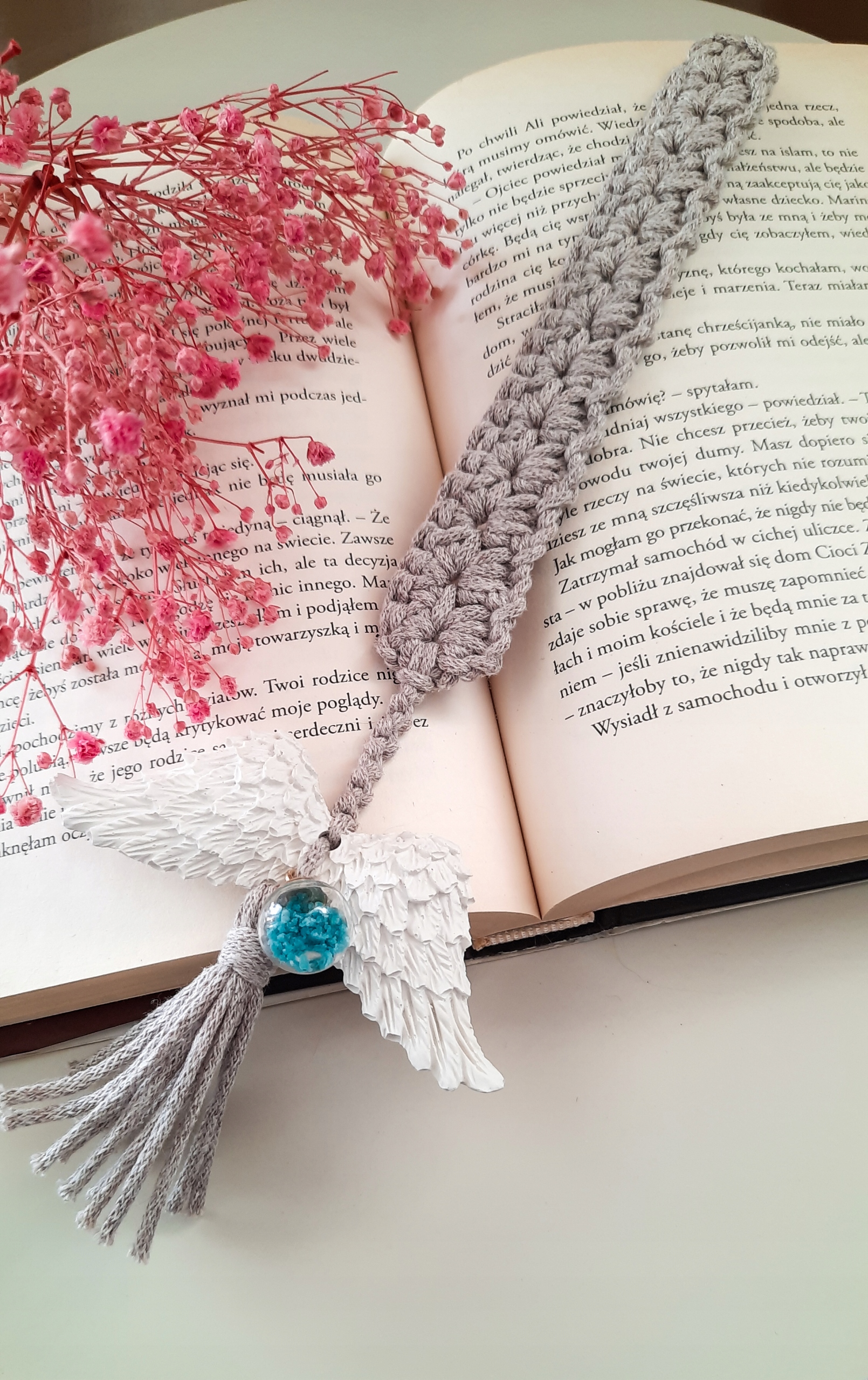 Сделанная часть вязания крючком состоит из толстого, слегка выпуклого плетения, которое одновременно создает твердую и декоративную структуру. Нижняя часть закладки украшена кисточкой из той же струны, которая плавно входит в декоративный элемент - крылья ангела, изливаемые из гипса полимерного.