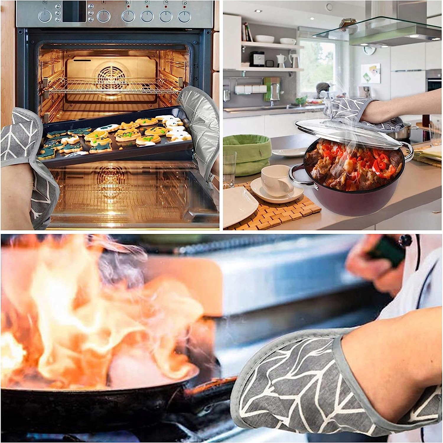 - 【премиальная ткань】 Комбинация хлопка для максимальной гибкости и тепловой защиты. Кухонные перчатки приятны на ощупь и дышат, чтобы защитить кожу для всех потребностей на кухне. Это также защищает рабочий стол от высоких температур. Ткань не деформируется легко. Кухонные перчатки также могут защитить стол или кастрюлю от повреждений. Держатель горшок имеет размеры 21 см х 21 см, а очень большая основание облегчает приготовление пищи и сжигание