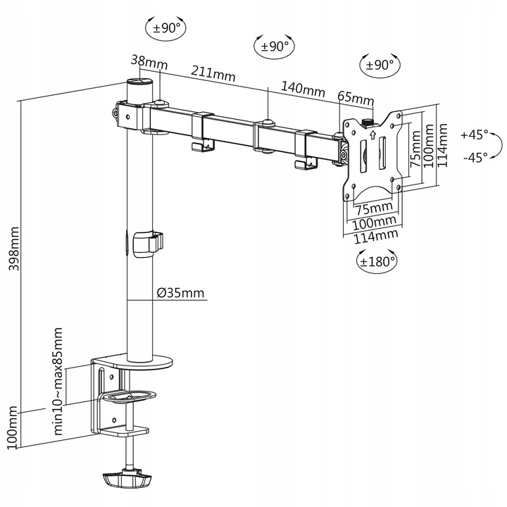 Универсальный ЖК -монитор держатель, приведенный с возможностью монтажа к столу или столу. Ручка была изготовлена из металла высочайшего качества (комбинация стали, алюминия давления и пластика) в черном. Элементы ручки монитора были идеально подходят для обеспечения стабильной и безопасной поддержки монитора.