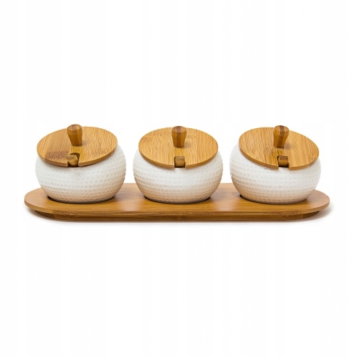 Декоративное решение для соли и всех видов специй было обнаружено в китайской кулинарной культуре. Полем Контейнер Jiao Spice подходит к этой китайской традиции и интерпретирует ее современным образом. 3 контейнера из белого, глазированной керамики на маленькой бамбуковой доске