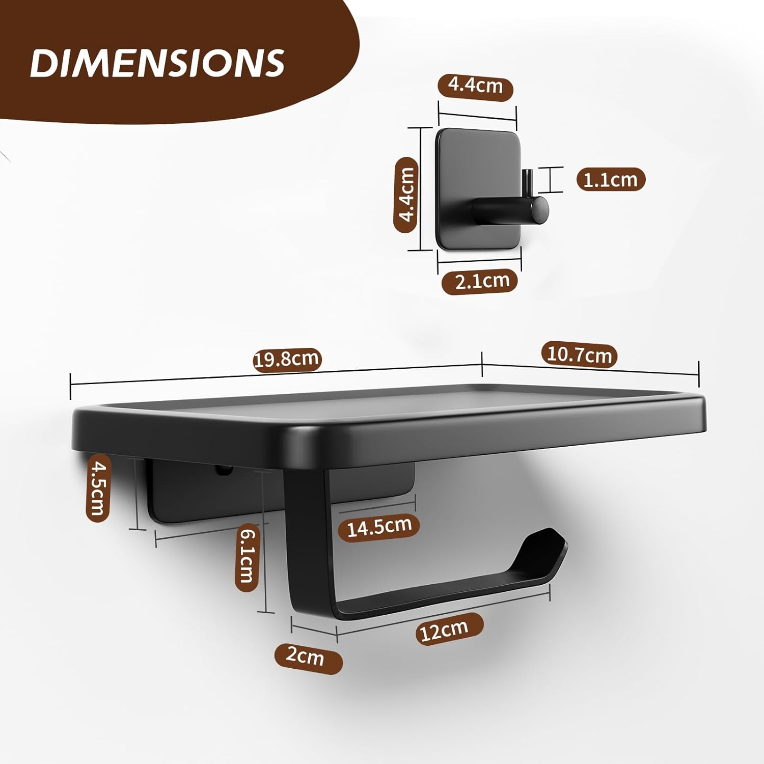 Держатель туалетной бумаги с полкой +2 матовых черных вешалок без бурения