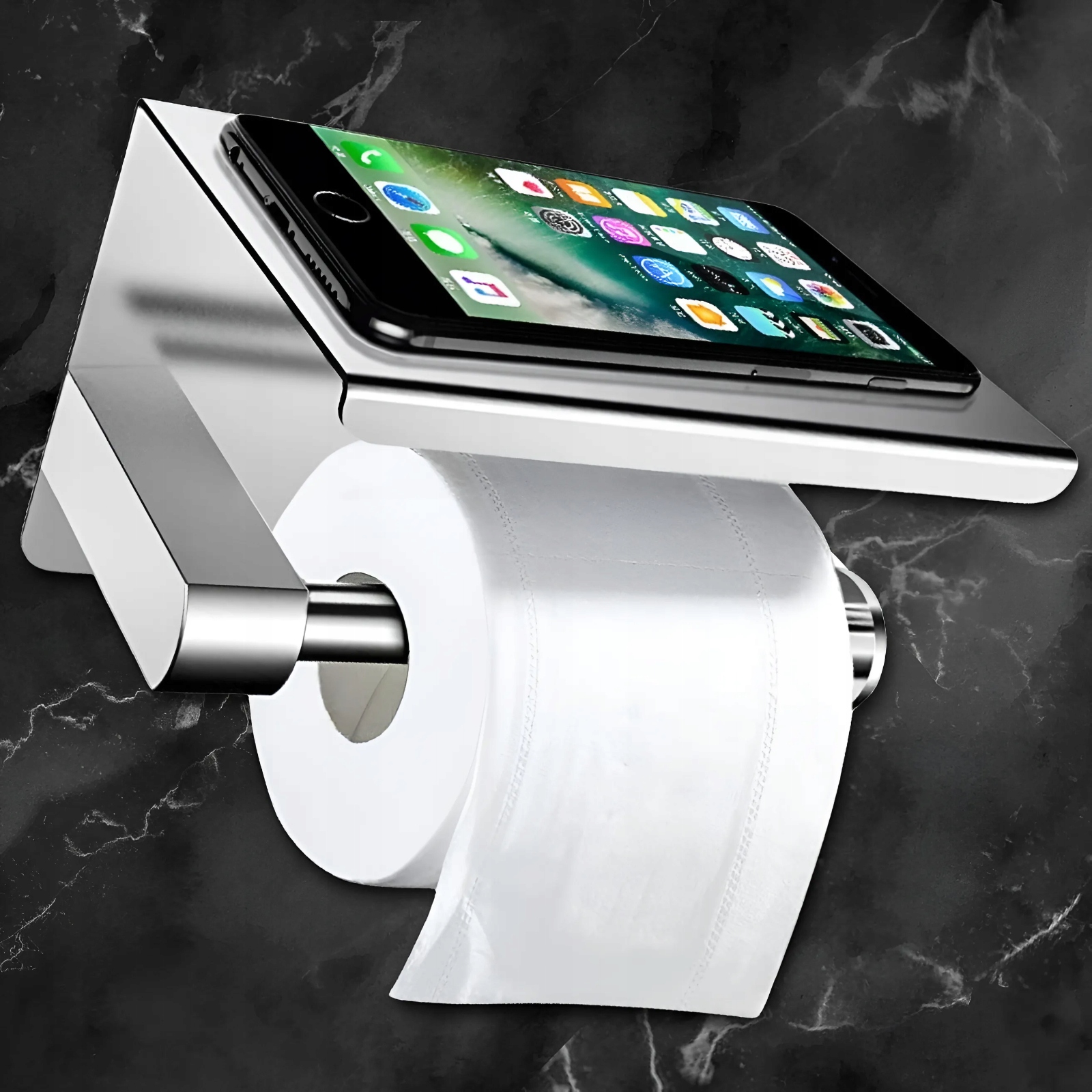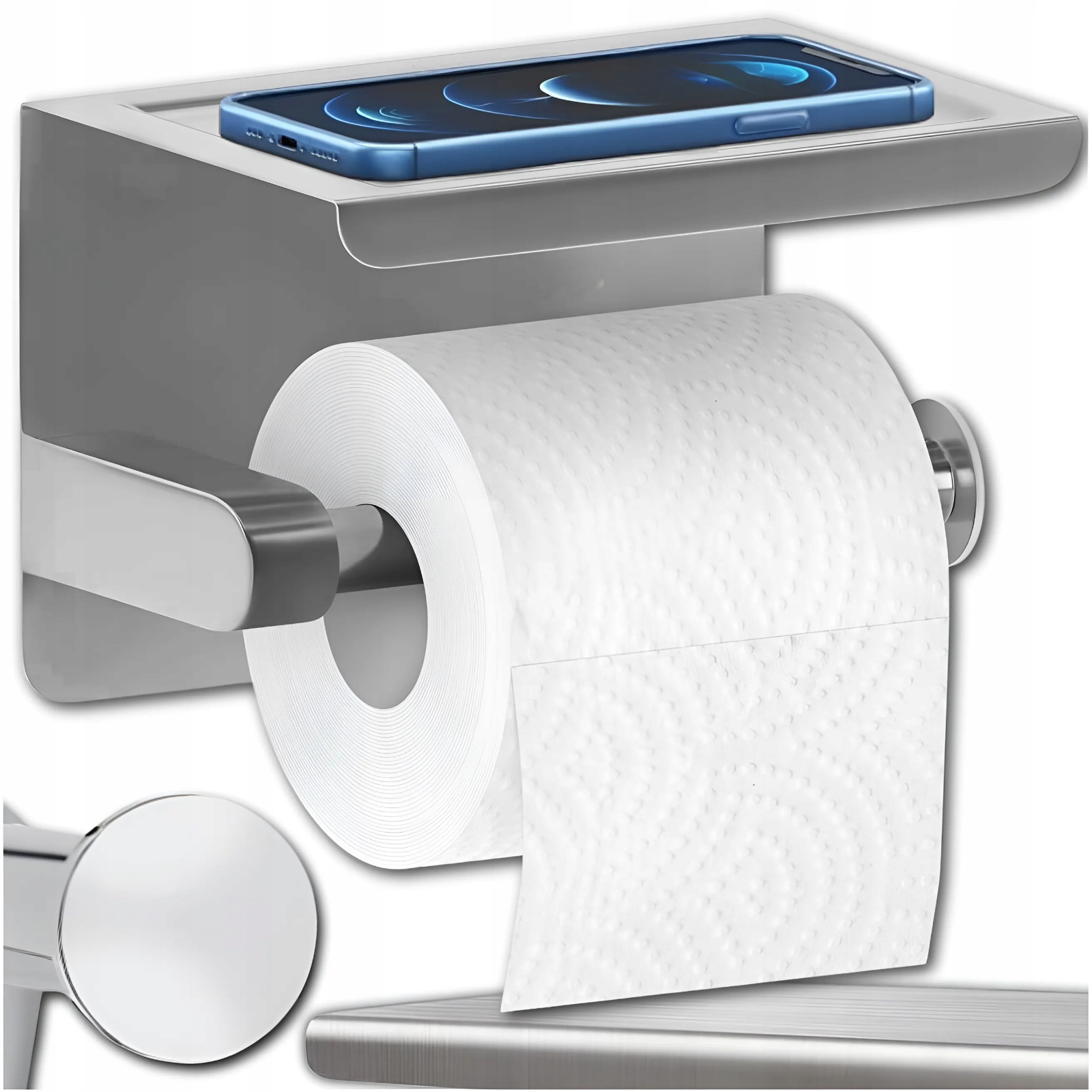 Держатель туалетной бумаги с полкой твердо изготовлен из лучших материалов, устойчивых к коррозии и повреждениям, что обеспечивает долговечность и надежность во влажной среде ванной комнаты.
