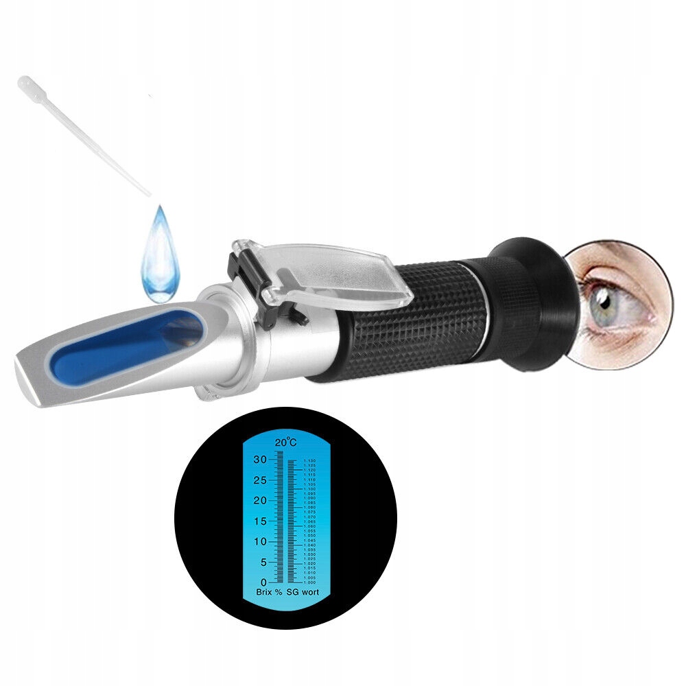 ✔︎umieś 2 lub 3 krople probki na glawnym pryzmacie, zamknij płytkę i spójrz przez okienko, aby odczytć wartoć watręcręcręcręcręcny ą kompensacją Температура: 10 ° C ~ 30 ° C (50 ° F ~ 86 ° F). нет необходимости исправлять предыдущее значение