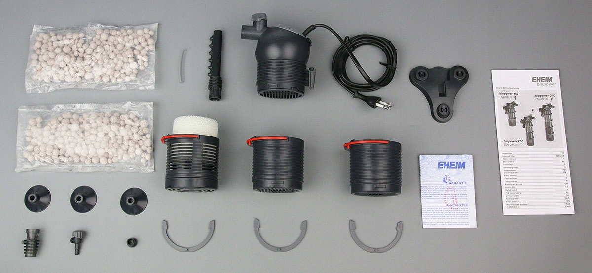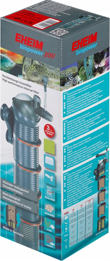 EHEIM BioPower 200 по структуре похож на EHEIM AquaBall, но отличается механизмом потока воды. AquaBall фильтрует воду через все корзины, как обычный внутренний фильтр. BioPower же всасывает воду только через нижнюю корзину, средние корзины закрыты. Благодаря этому вода последовательно проходит снизу через все корзины, благодаря чему внутренний фильтр приобретает метод фильтрации, используемый во внешних фильтрах. Средние корзины заполнены биологическим картриджем EHEIM, что делает его еще ближе к внешнему фильтру. Фильтр имеет систему быстрого демонтажа последующих корзин easyClick, которая значительно ускоряет разборку фильтра для чистки. Дополнительным преимуществом является энергоэффективность фильтров этой серии. В комплект входит диффузор и тропический душ с руководством пользователя на польском языке.