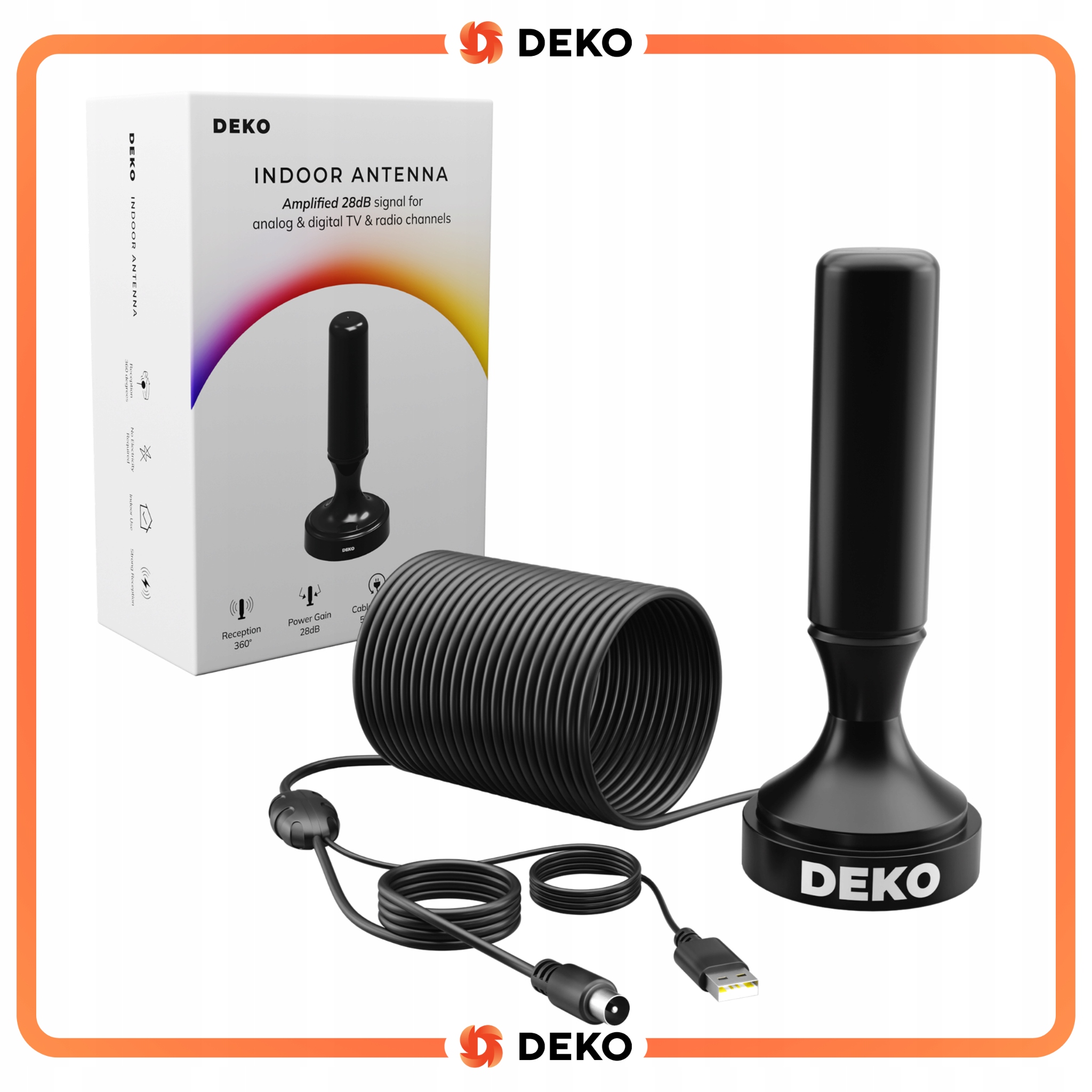 ► Антенна Deko была разработана для высочайшего качества наземного телевидения. Благодаря встроенному усилителю 28 дБ качество принятия стабильно и без помех.