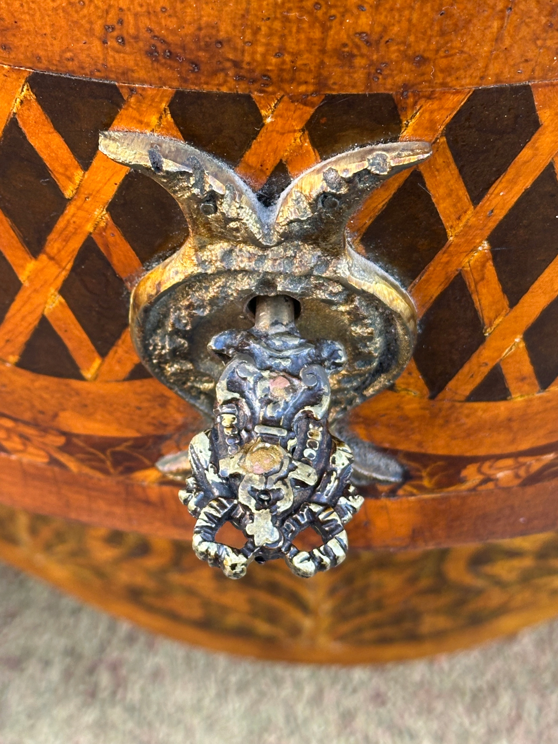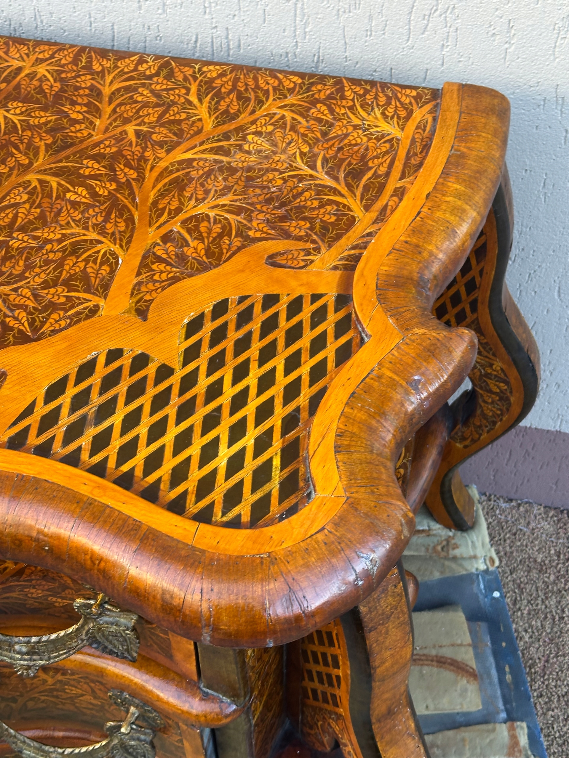 Уникальный грудь ящики рука -ин -инкоретизации. Имеет 2 очень больших ящиков с уникальными латунными ручками. Красиво инкрустируются мотивами на весь комод