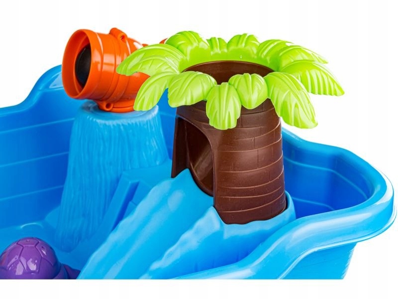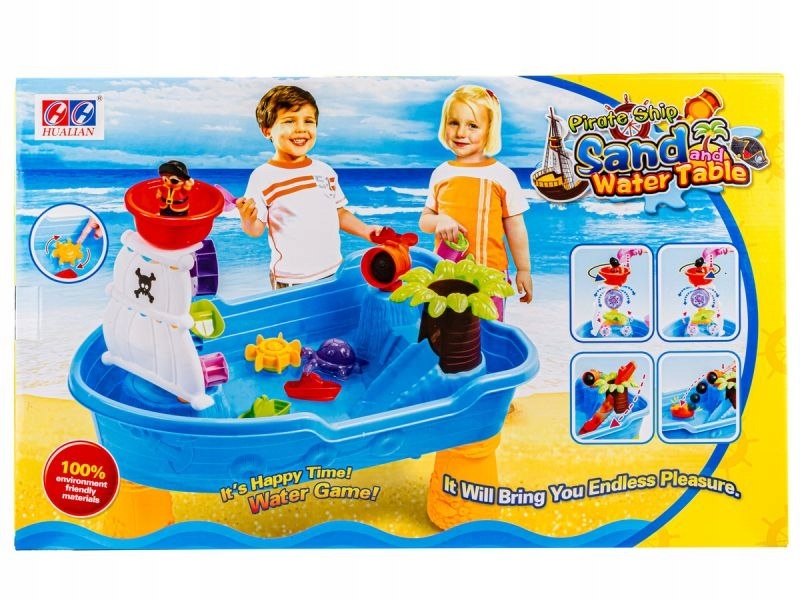 Весь комплект — стол, служащий столом-песочницей - выглядит как пиратский корабль. Он оборудован пушечной установкой и пальмой, которая одновременно является горкой для мячей и лодок. В передней части лодка оснащена огромными парусами, за которыми находится песчаная или водяная мельница. Одна игрушка предлагает множество забавных возможностей. После игры мы можем положить все обратно в песочницу.