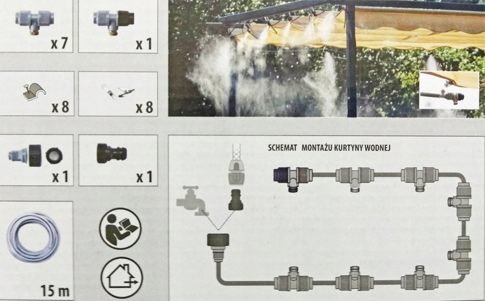 Водяной занавес используется для охлаждения летом благодаря производству тонкого тумана через тонкие сопла. Паровая вода получает тепло от окружающей среды, что приводит к воздушному охлаждению в жаркие дни Макс. Чем выше температура воздуха, тем больше эффект охлаждения. Его также можно использовать для заповедника в пластиковых туннелях, умножения и теплиц. Установка форсунок возможна через любые интервалы на 15 -метровой секции монтажной трубы. Рабочее давление занавеса составляет 1,5-4BAR, что позволяет подключаться к большинству водных установков. При использовании воды из резервуара, пруда или ствола, используйте небольшой мощный насос или гидрофор