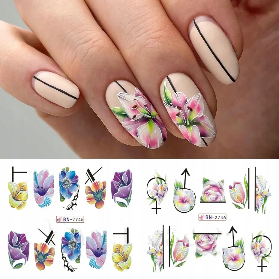 ВОДНІ НАЛІЙКИ для декору нігтів, аркуш 12 візерунків, квіти, літні прикраси