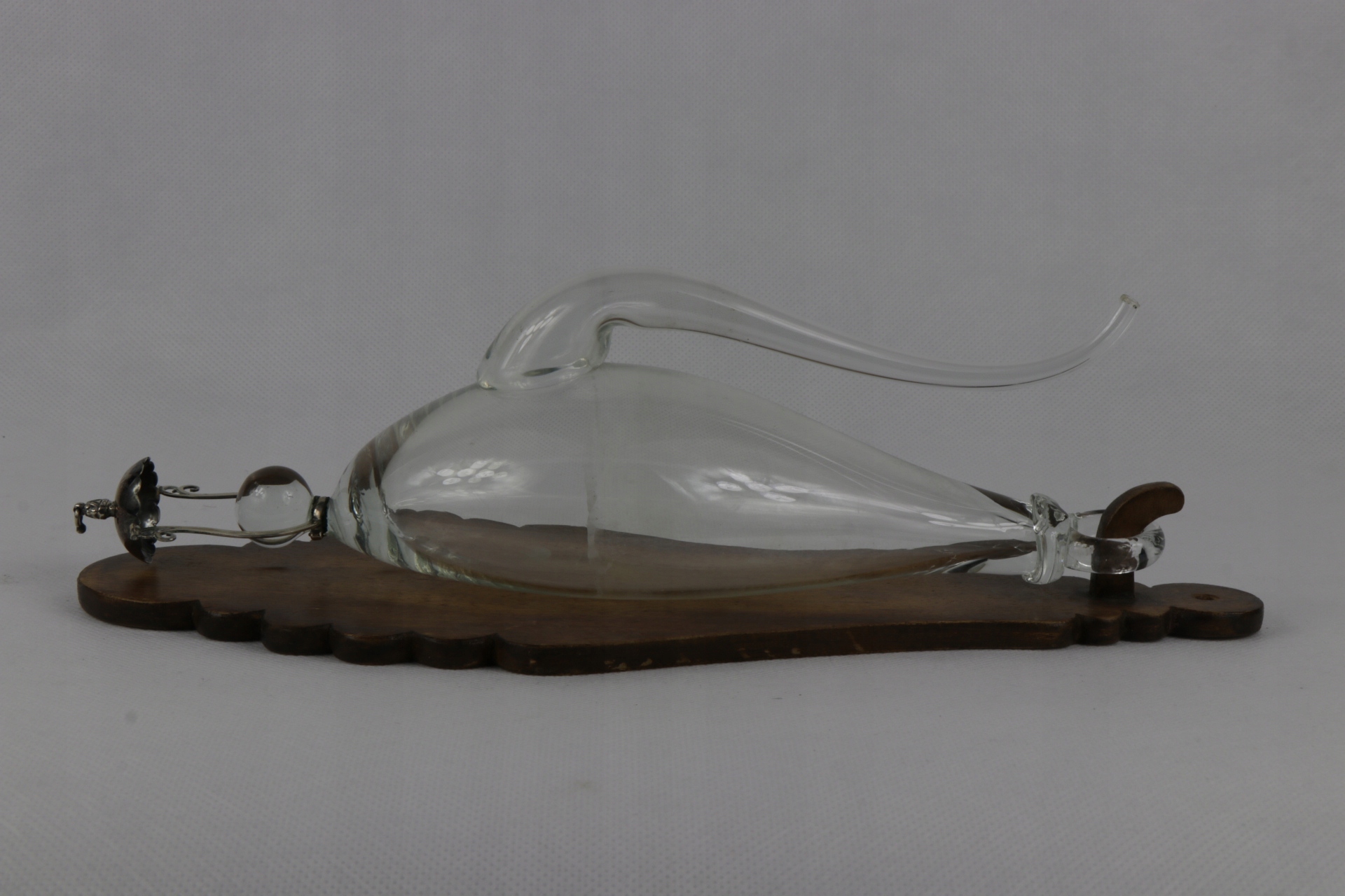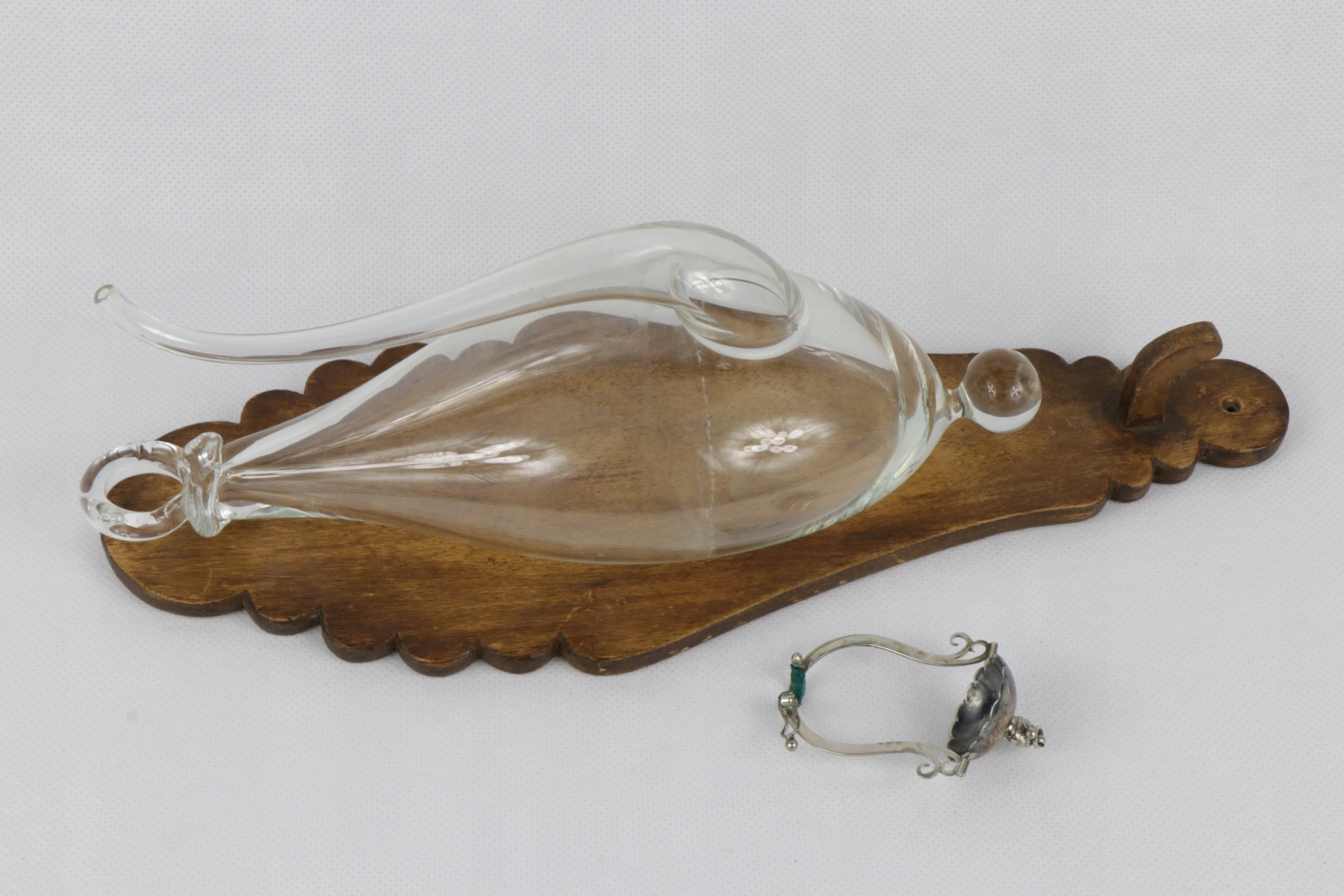Интересный старинный водный барометр XIX или начала XIX века. Барометр будет прикреплен к деревянной подвеске, небольшому серебряному блюдцу для проточной воды и сливу. Серебро, без подписи.