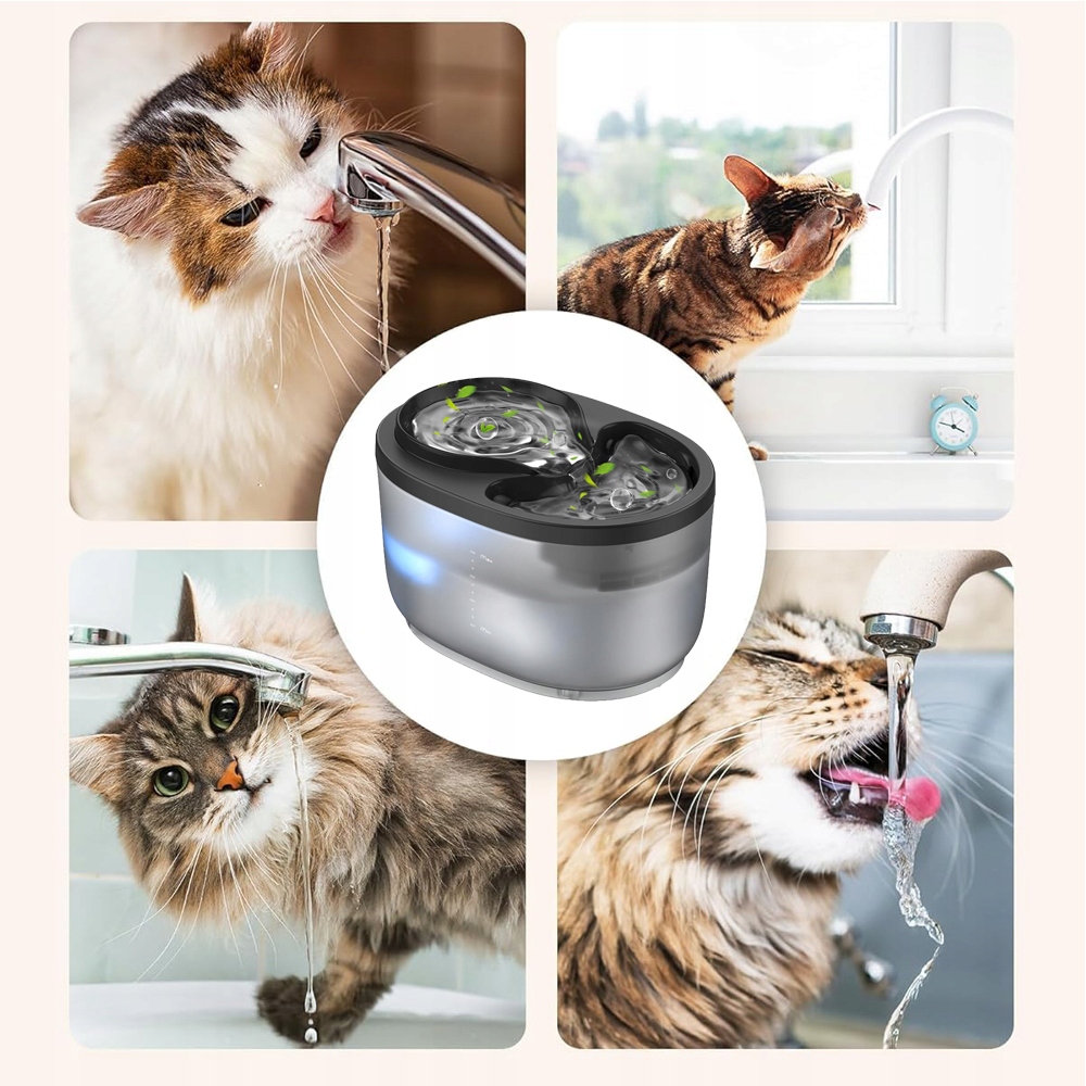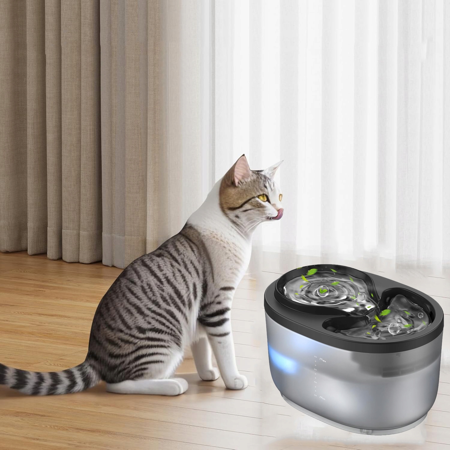 🐈 Прозрачный фонтан с светодиодным освещением: Прозрачный резервуар со встроенным светодиодным освещением облегчает контроль уровня воды в любое время. Деликатный синий светодиод также помогает проверить фонтан ночью, не удаляя крышку.