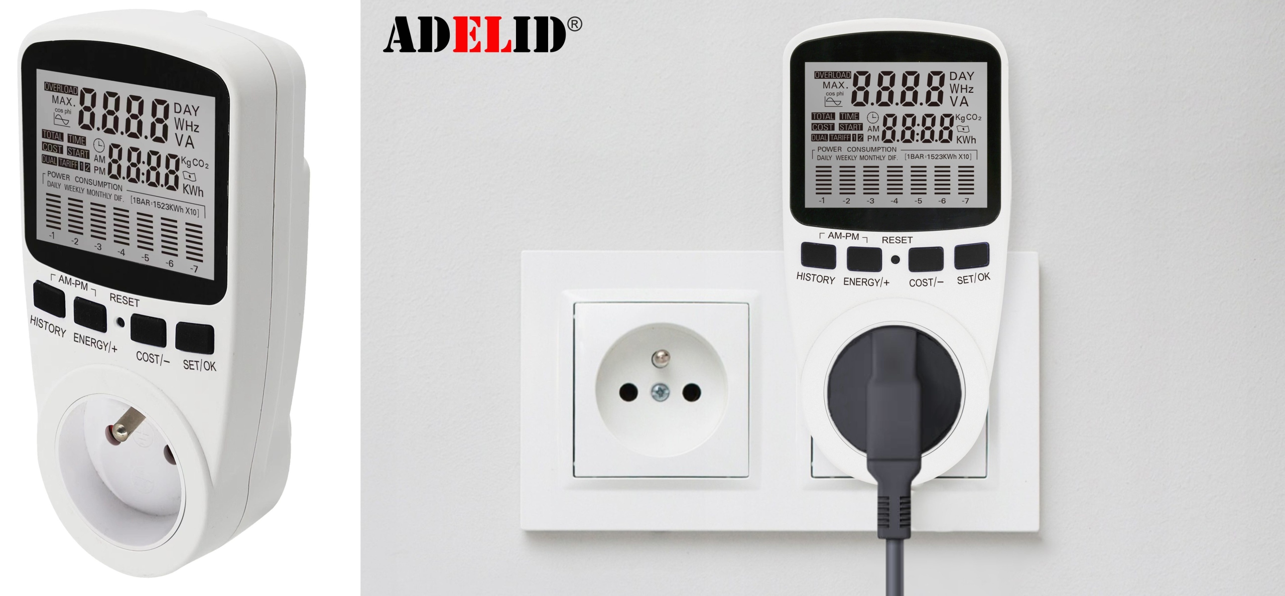 Ваттметр Adelid позволяет не только контролировать потребление электроэнергии. Устройство также будет отображать информацию о напряжении и мощности подключенного устройства. После ввода данных, связанных с затратами на электроэнергию, ваттметр сам выполнит соответствующие расчеты. При необходимости вы можете определить цену одного киловатта часа для двух разных тарифов, указав срок действия. Множество функций обеспечит соответствующую точность измерений, и вы сэкономите драгоценное время, необходимое для преобразования данных.