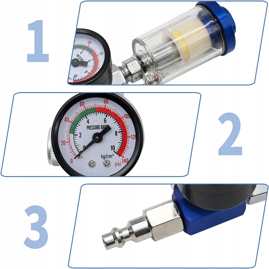 ✅ Диапазон регулировки давления 0–150 фунтов на квадратный дюйм: рабочее давление можно регулировать от 0,1 до 0,9 МПа (0–150 фунтов на квадратный дюйм). Устройство оснащено манометром, отображающим давление в режиме реального времени, что позволяет точно контролировать давление в источнике воздуха, равномерно распределять краску по пистолету, более стабильно работать пневматическими инструментами и повышать эффективность работы.