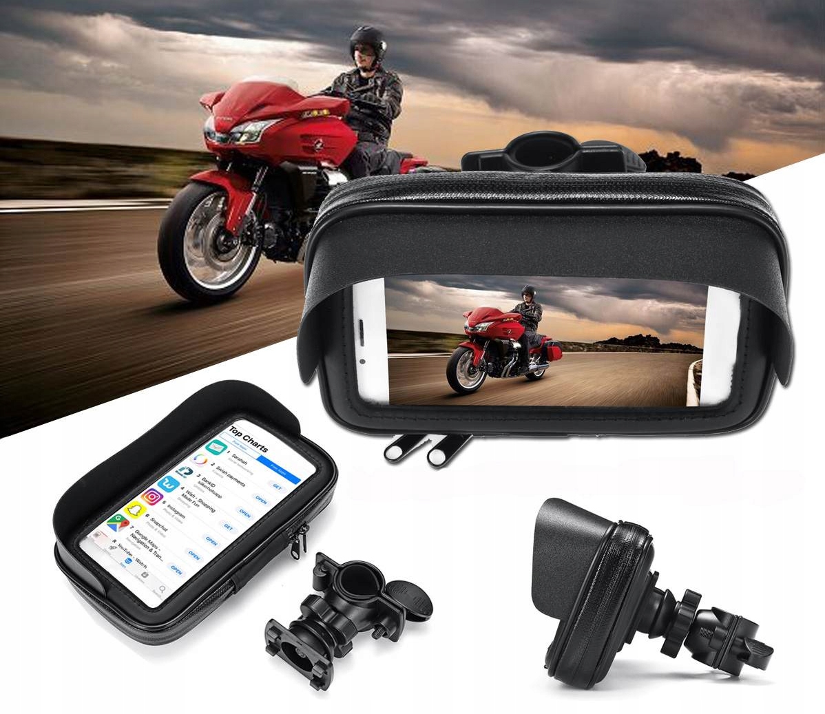 Чехол водонепроницаем, поэтому его можно использовать в любых погодных условиях. Защищает от воды, грязи и пыли. Застегивается на две молнии. Его самым большим преимуществом является солнцезащитный козырек для лучшей видимости экрана при ярком солнечном свете. Установка осуществляется с помощью регулируемого крепления на руль, входящего в комплект. Система крепления позволяет легко и быстро снять корпус и устройство с держателя. Корпус можно наклонять и вращать на 360 градусов. Две сменные вставки предотвращают перемещение телефона или навигатора во время вождения. Они также позволяют приблизить экран телефона к сенсорному элементу корпуса. Прозрачный сенсорный материал позволяет пользоваться телефоном, не вынимая его из чехла.
