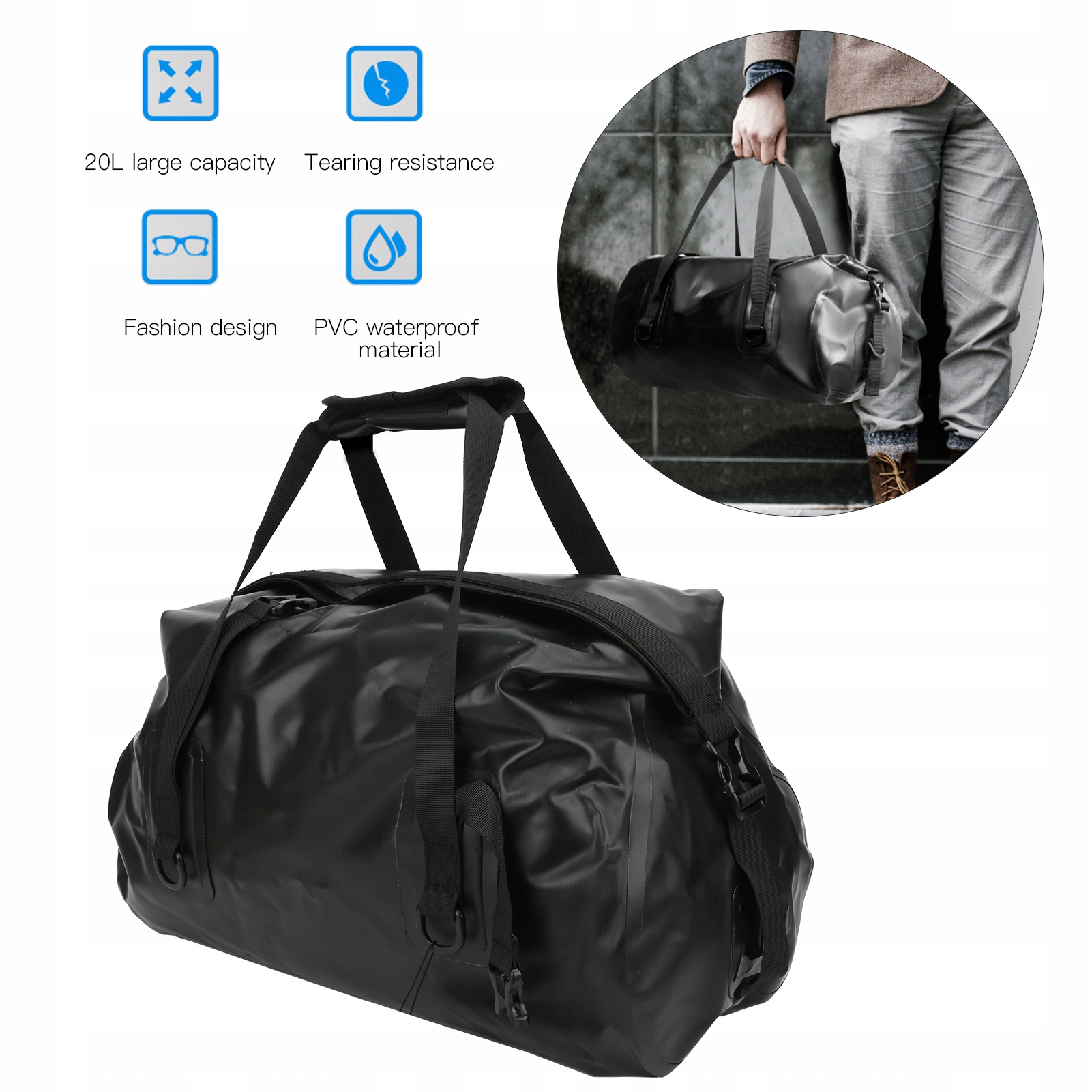 - Назначение: большая вместимость, можно упаковать больше ручных предметов. Водонепроницаемая сетчатая ткань 500DPVC гарантирует, что сухие вещи не намокнут.
