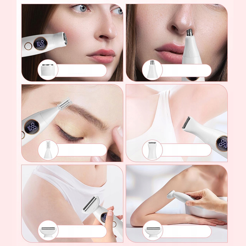 Комплект безопасности для женщин содержит 5 сменных голов: триммер бровей, голова носа, голова для коротких волос, длинная голова волос, круглая голова. Одно устройство до 5 приложений, подходящее для всех частей тела, цель - где бы вы ни хотели: подмышки, руки, ноги, бровь, борода, баки, бикини, подходящие для путешествия дома мини -портатив.