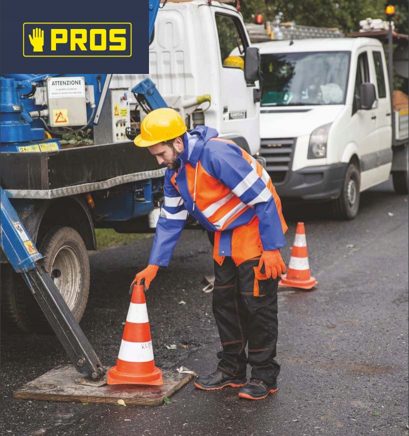 Двухнокоронированная куртка с желобами, истощающими капающую воду, закрепленную покрытой на молниеносной молнии. У него есть капюшон, два боковых кармана, покрытые лоскутами, регулировкой рукава и отверстиями для вентиляции под подмышками. Отражающая лента увеличивает видимость сотрудника. Модель, изготовленная из двух типов водонепроницаемых покрытых тканей Plavitex и Plavitex Fluo.