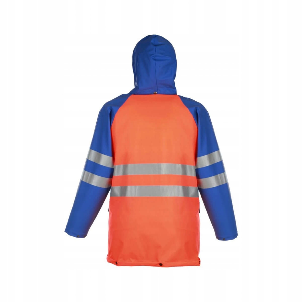 Две -тоновая куртка с желобами, истощающими капающую воду, закрепленную крытой питательницей. У него есть капюшон, два боковых кармана, покрытые лоскутами, регулировкой рукава и отверстиями для вентиляции под подмышками. Предупреждающая лента увеличивает видимость сотрудника. Модель из двух типов гидроизоляции Plavitex и Plavitex Fluo Fabrics. Предназначен для использования в неблагоприятных погодных условиях, когда видимость ограничена. Обеспечивает эффективную защиту от ветра и дождя. Техника двусторонней сварки увеличивает прочность швов. Продукт соответствует стандартам европейских стандартов: EN ISO 13688, EN 343 и EN ISO 20471.