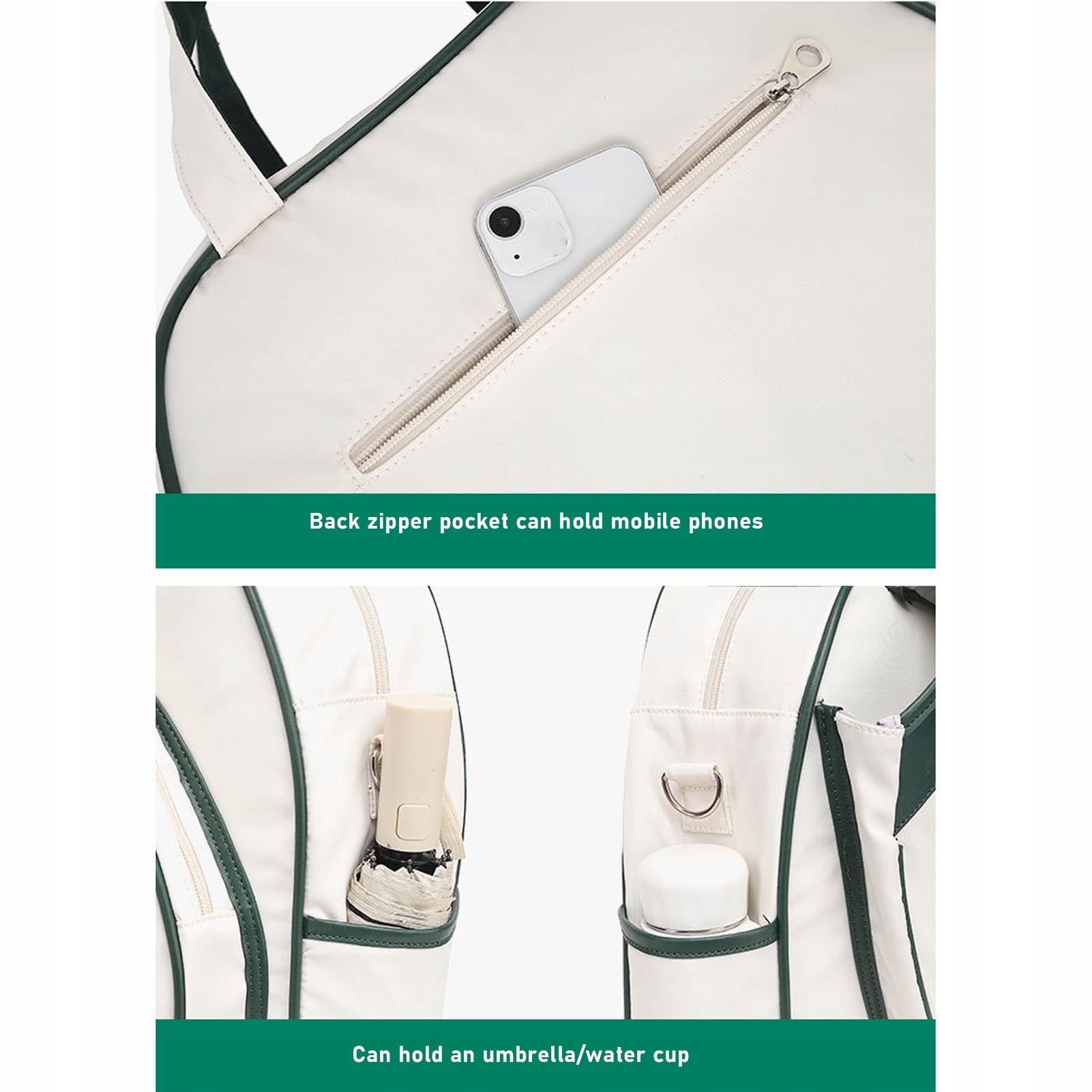 1. Отдельная обувная камера: теннисный пакет содержит специальное боковое отсек для обуви, обеспечивая продуманную конструкцию, которая поддерживает организованное и гигиеническое оборудование, разделяя объекты в сумке.
