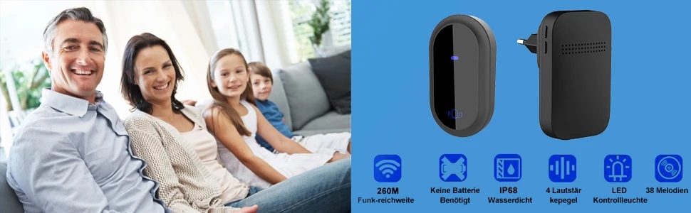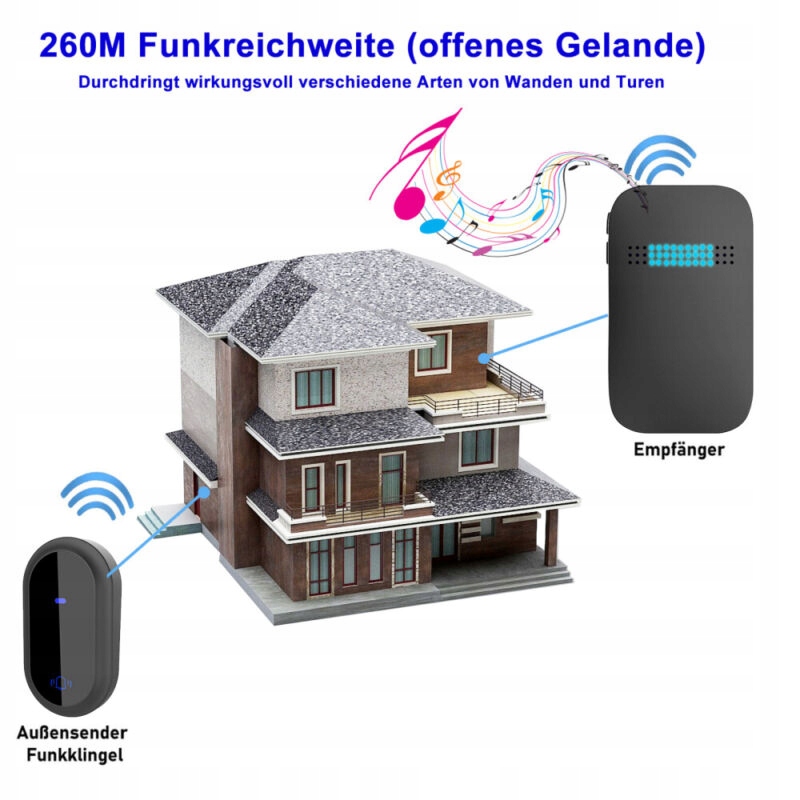 【Легкая установка】 Просто подключите мини -приемник к электрическому розетке и прикрепите передатчик к стене, используя доступные аксессуары, включая кусок самооклонной ленты. Наш дверной звонок подходит для дома, квартиры, школы, дома в сельской местности, офиса и многое другое. Этот беспроводной дверной колокол без батареи - хороший рождественский, день рождения или юбилейный подарок для каждого дома или владельца компании.
