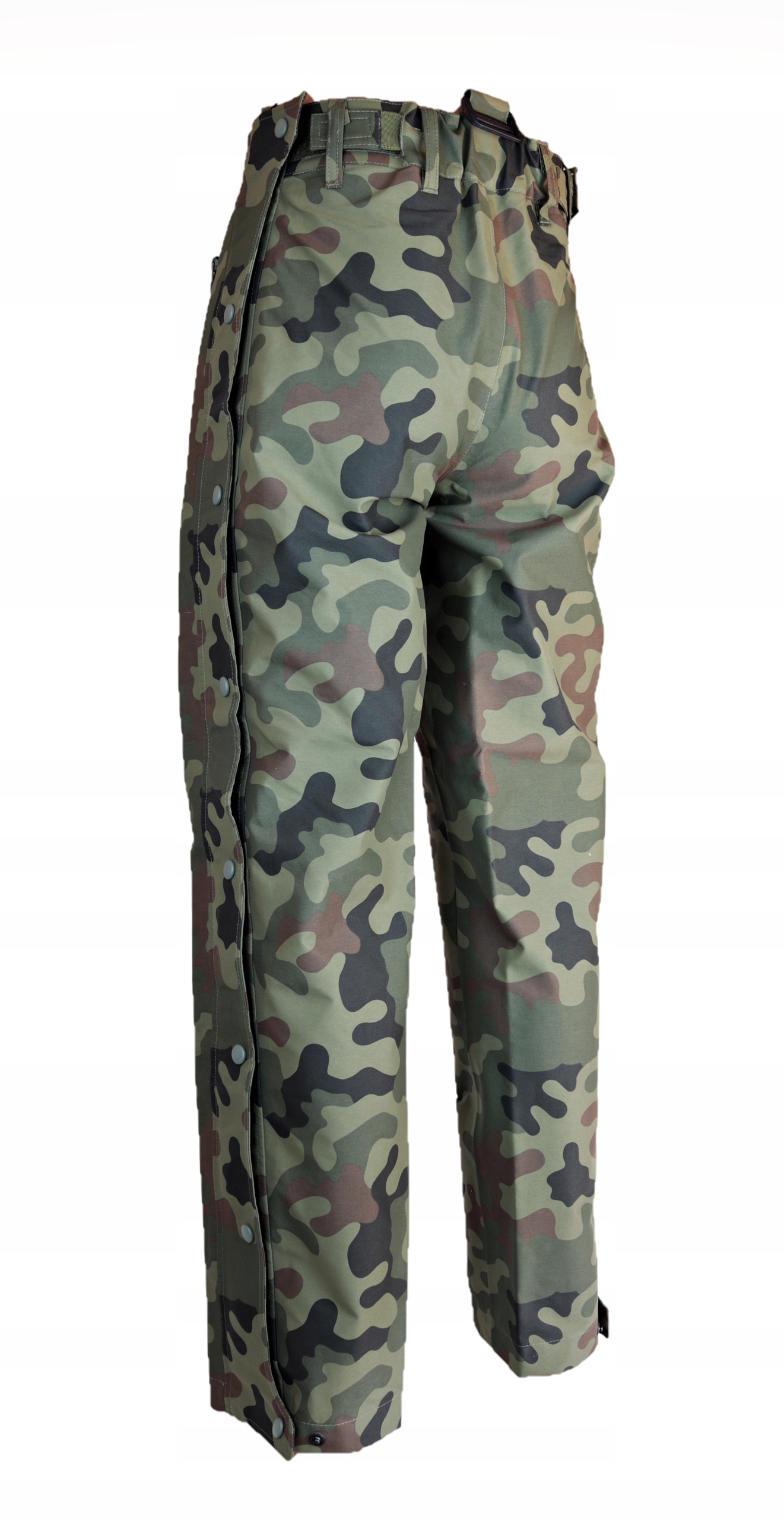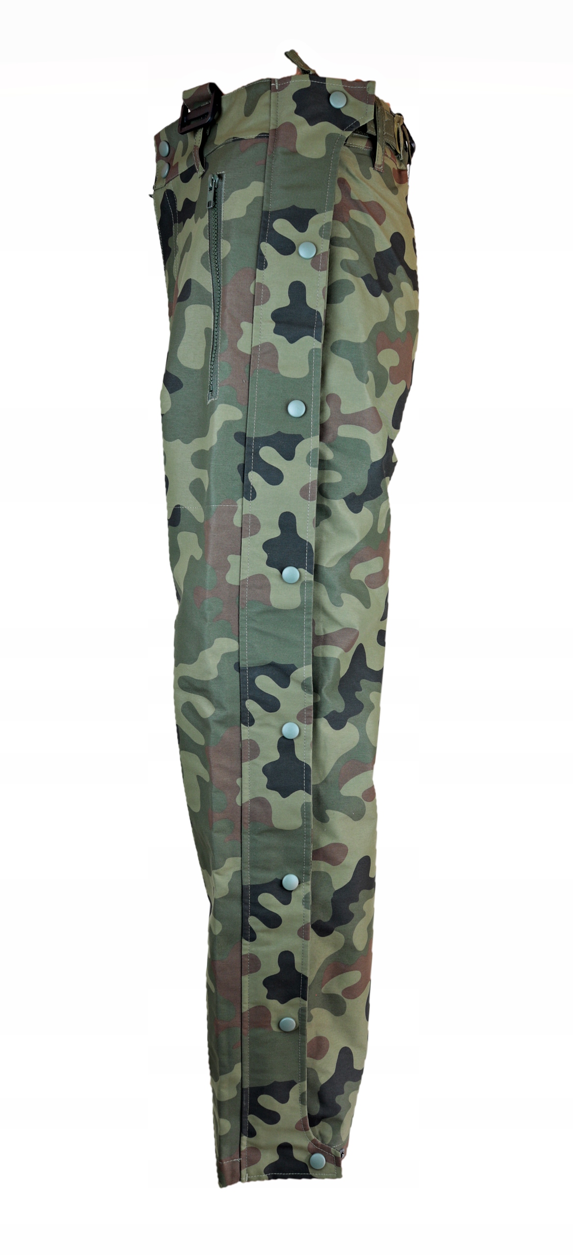 Молнии по всей длине штанин, покрытые клапаном на кнопках, позволяют быстро надевать и снимать при необходимости.