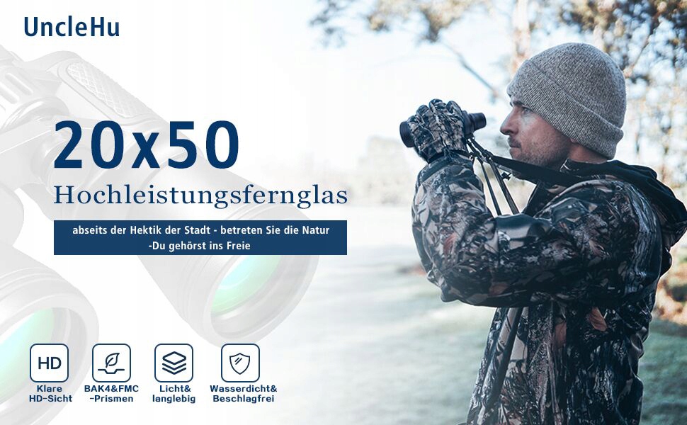 Высокопроизводительный бинокль UncleHu 20x50 для взрослых, компактный водонепроницаемый бинокль ночного видения с низкой освещенностью для наблюдения за птицами, охоты, путешествий, футбольных матчей и наблюдения за звездами с футляром и ремешком