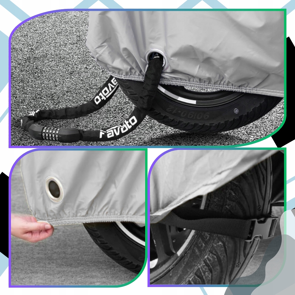 ✅ Выбирайте элегантность и функциональность. Черно-серебристый водонепроницаемый чехол XL для мотоцикла, скутера и велосипеда — это сочетание практичной защиты с эстетичным внешним видом, которое оправдает ожидания каждого водителя.