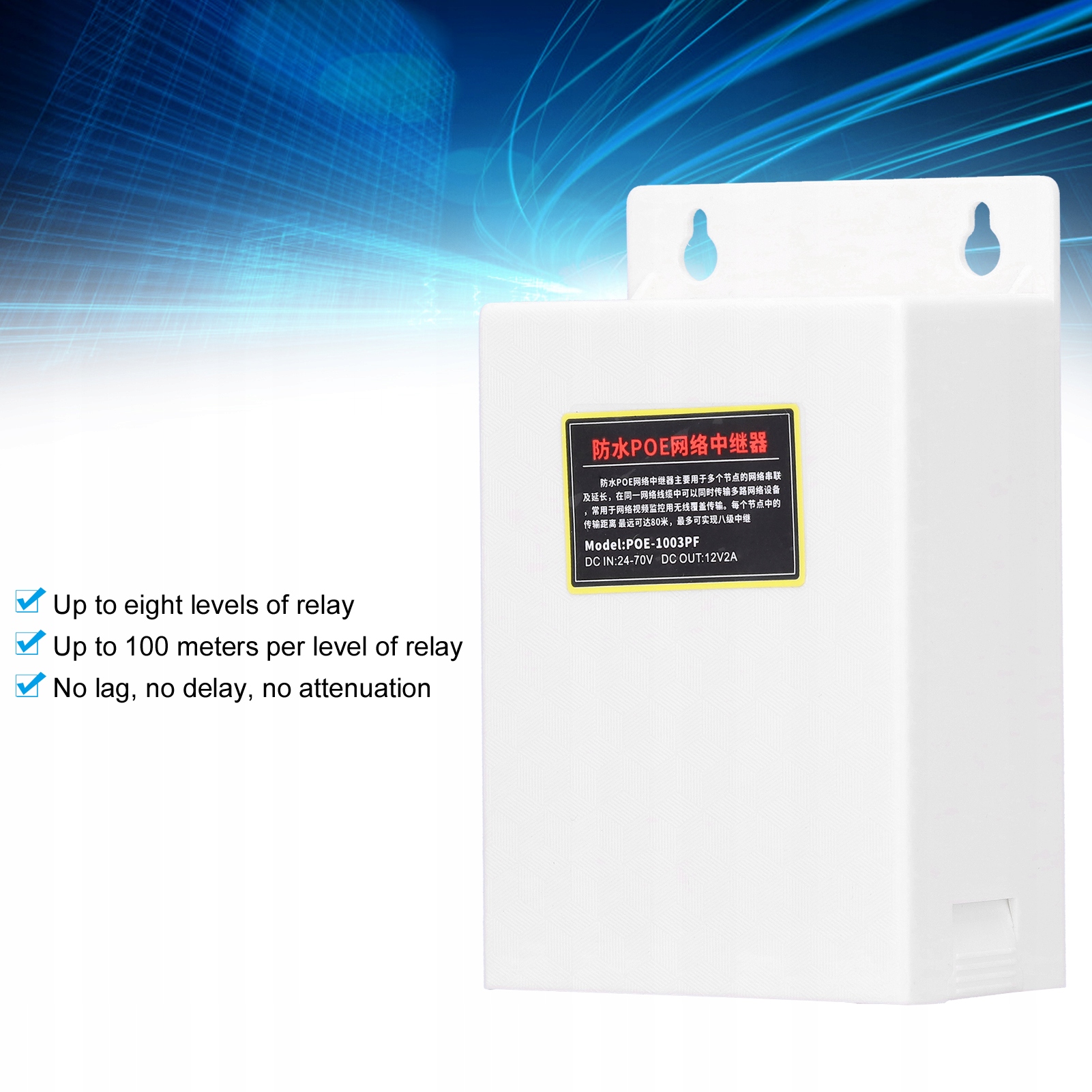 1. До 8 уровней ретранслятора, каждый уровень ретранслятора может достигать 100 метров, без зависаний, без задержек и без затухания. 2. Подключение сетевого кабеля, нет необходимости в собственном POE камеры, нет необходимости в разветвителе POE. 3, супер водонепроницаемый для использования в помещении и на открытом воздухе, очень высокая безопасность, отсутствие страха перед суровыми условиями окружающей среды. 4. Входное напряжение 15-70 В, выходное напряжение 12 В, выходной ток 2 А. 5. Простота в эксплуатации и быстрая установка, это не займет много времени, это очень удобно.