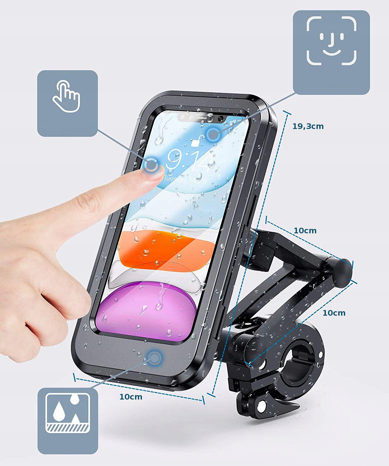 Водонепроницаемый держатель для телефона имеет закрытую конструкцию, что делает его более безопасным, чем большинство держателей для велосипедных телефонов, доступных на рынке. Обеспечивает водонепроницаемость IPX6, чтобы полностью защитить ваш телефон от дождя, снега, грязи и брызг пыли. Уникальная система регулировки винтового крепления и ударопрочный чехол защищают ваш телефон от падений.