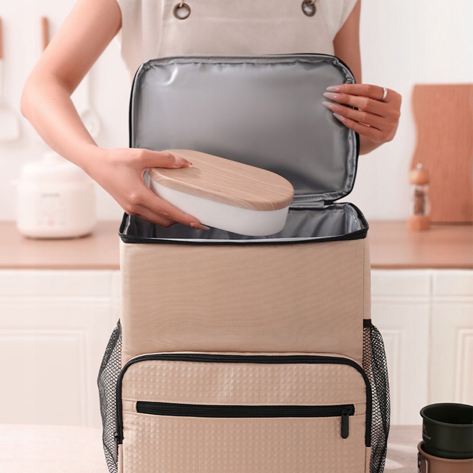 1. 3-слойная изоляционная ткань: этот рюкзак-холодильник, созданный на основе 3-слойной тканевой структуры, эффективно поддерживает внутреннюю температуру в течение более длительных периодов времени. Он идеально подходит для перевозки еды и охлажденных напитков в различных ситуациях.
