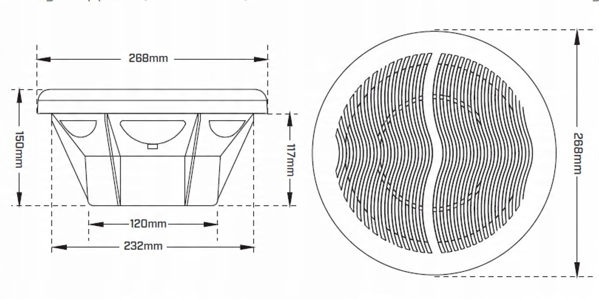 Общий диаметр 168 мм, монтажная глубина 117 мм, диаметр выреза 232 мм p>
