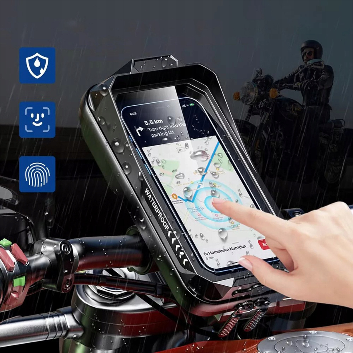 1. Водонепроницаемый IP66, с конструкцией сенсорного экрана, обеспечивая полный доступ к экрану телефона, вы можете использовать GPS во время вождения.