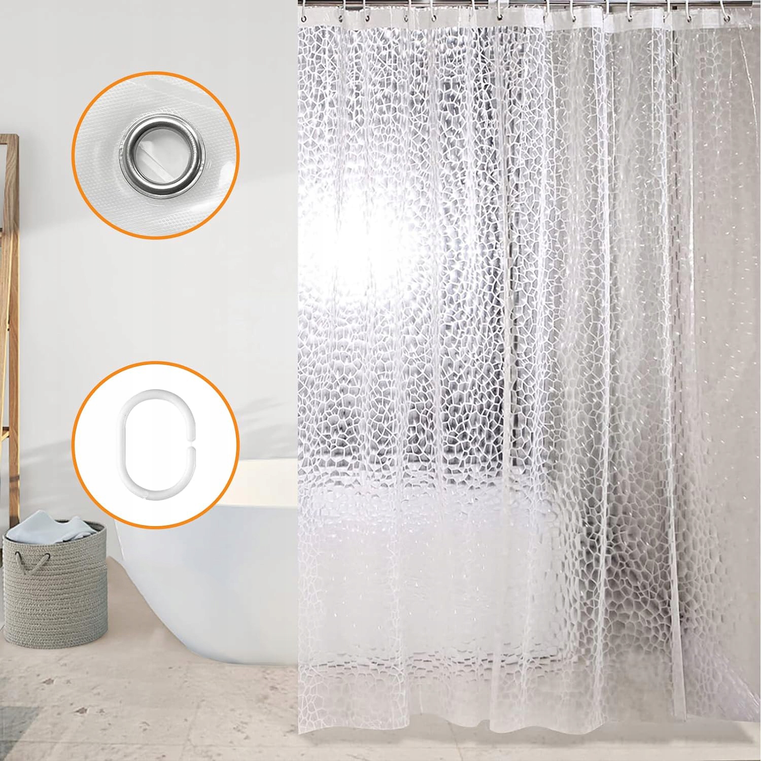 🛀ax Преимущества занавески душа EVA: Наша занавеска для душа - это водонепроницаемая, устойчивая к влаге, антибактериальная, устойчивая к плесени, прост в очистке и эксплуатации, обеспечивая чистую и безопасную среду. Элегантный 3D -эффект, полупрозрачный: прозрачная занавеска для душа защищает уединение благодаря 3D -эффекту, благодаря которому свет проникает в зону ванны, но никаких деталей зоны ванны не видно, не имеет осторожной красоты. Толщина и идеальная естественная драпировка, благодаря которой занавеска для душа не плавает и не прикрепляется к телу во время купания, подходит для общежития, отелей, спортивных залов и клубов.