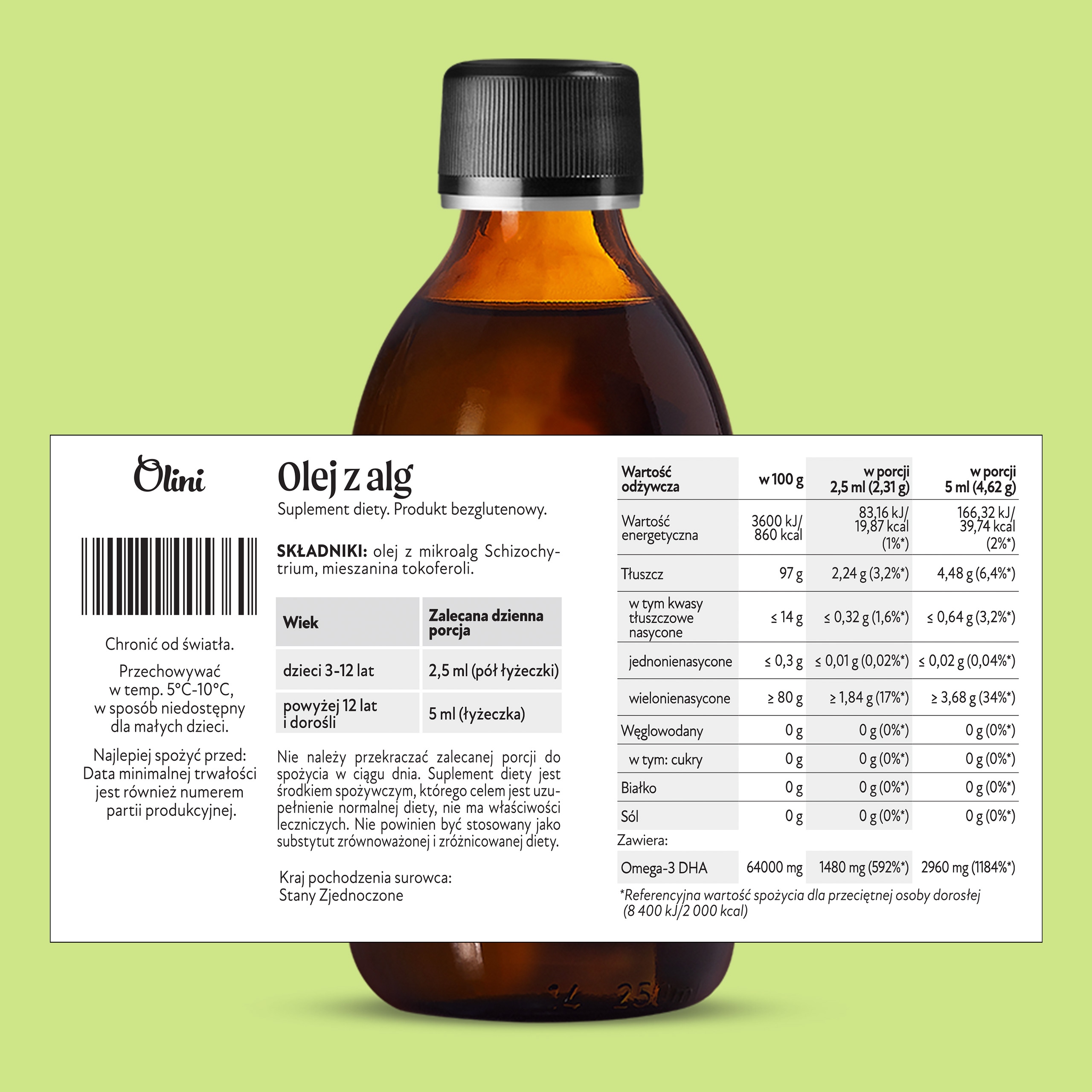 Масло водорослей Olini имеет высокое содержание омега-3 кислот, включая: