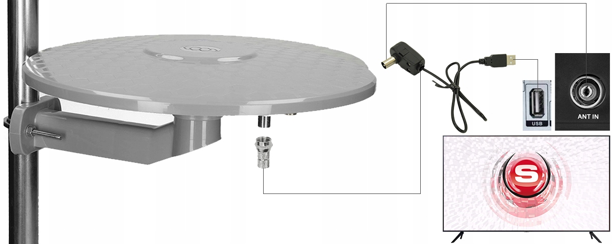 Антенна DVB-T2 поставляется с разъемом типа F, готовым для установки на коаксиальный кабель, например RG-6 (в комплект не входит). Антенна оснащена источником питания USB, который обеспечивает правильную работу встроенного в антенну усилителя. Для правильной работы антенны коаксиальный кабель должен быть правильно установлен внутри вилки питания антенны. Затем подключите USB-штекер к свободной розетке телевизора или декодера, а антенный штекер подключите к Antenna IN (ВХОД антенны) ТВ-приемника или к внешнему тюнеру DVB-T/DVB-T2.