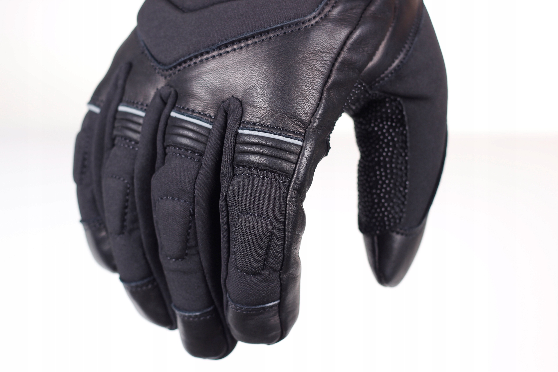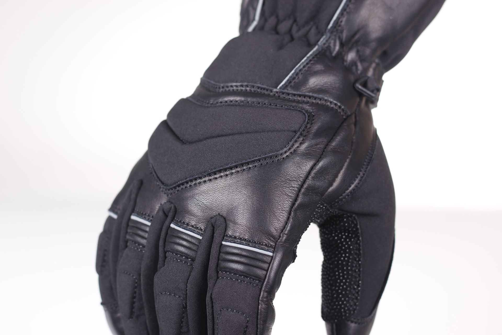 Кожано-текстильные перчатки с водонепроницаемыми свойствами с длинным вырезом на манжете, позволяющим легко надеть его на рукав мотоциклетной куртки.