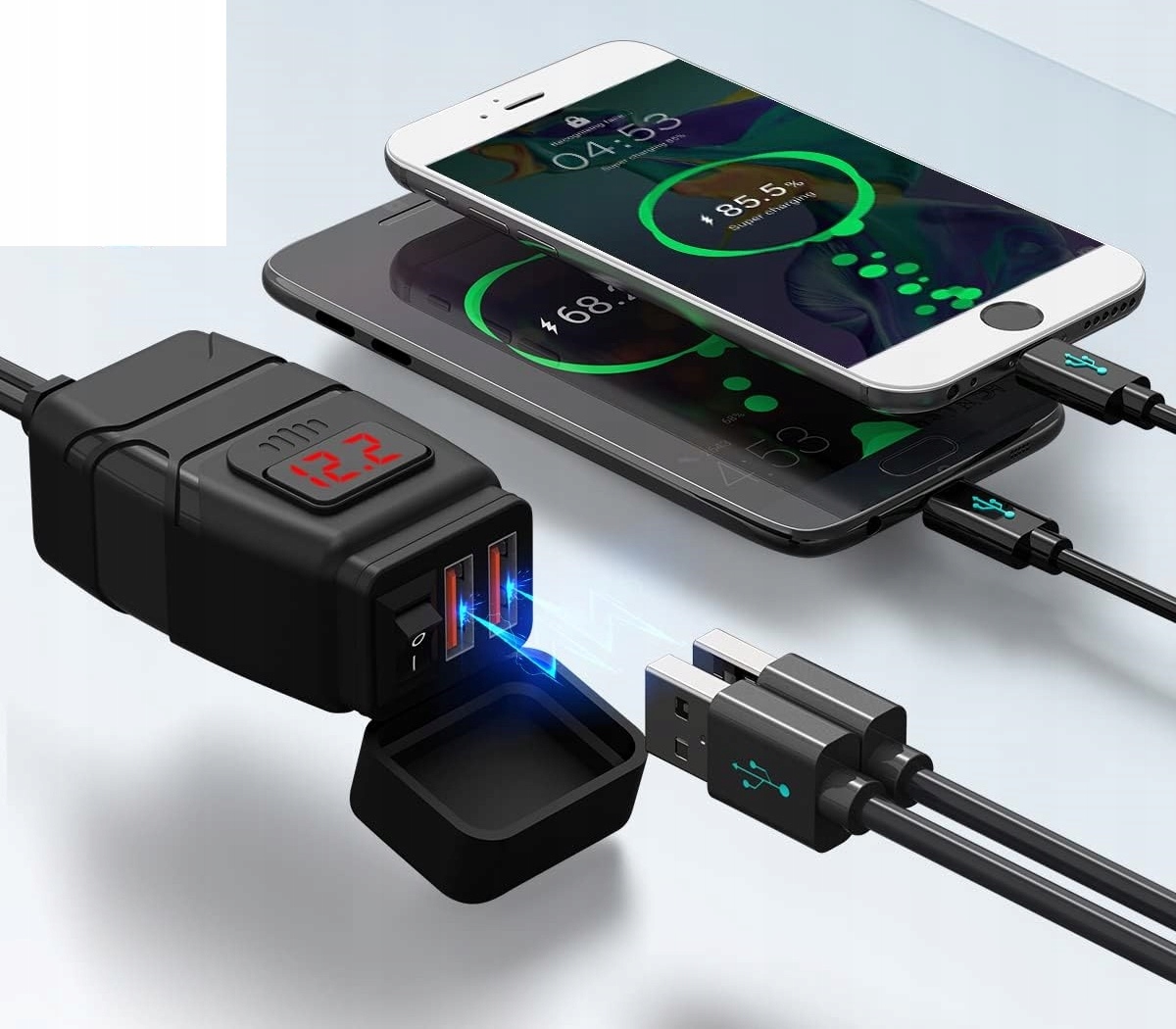 Водонепроницаемый зарядное устройство для мотоцикла, главным преимуществом которого являются два USB-порта для быстрой зарядки QC3.0, благодаря которым ваш телефон никогда не разрядится во время поездки. Комплект позволяет использовать обе розетки одновременно, т.е. заряжать напр. навигация и телефон одновременно.
