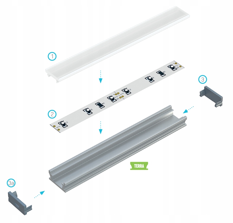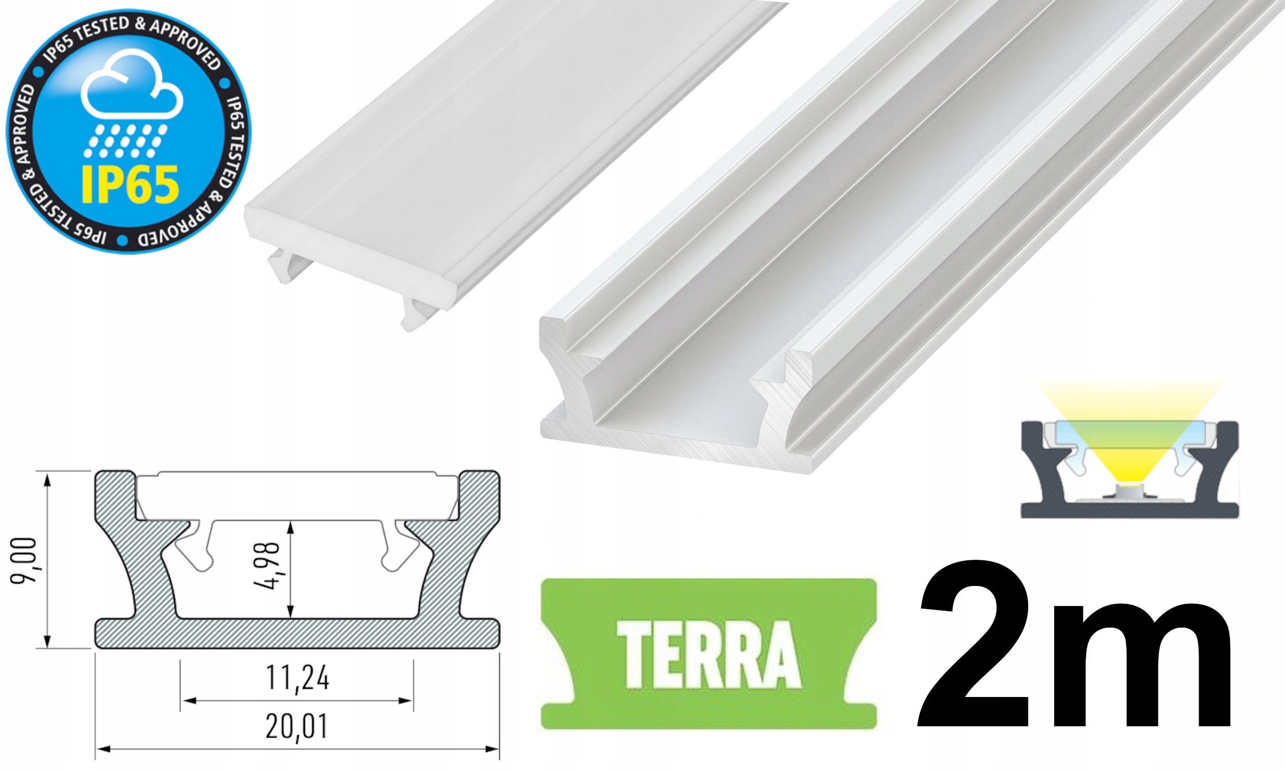 Профиль TERRA благодаря своей водонепроницаемости идеально подходит для внутреннего применения, например, в ванных комнатах или там, где нам необходимо защитить ленту от влаги. Его можно использовать в душевых кабинах, в качестве напольного или потолочного освещения, на полках, полках в ванной и для подсветки зеркала. Этот профиль также подходит для наружного применения для подъездных дорожек, потолочных перекрытий, наружных лестниц и террас. Благодаря уплотняющему рассеивателю, который предотвращает намокание светодиодной ленты.