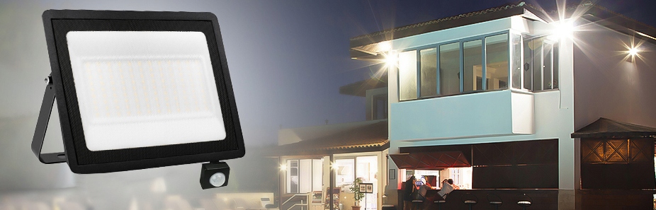 Светодиодный прожектор/отражатель мощностью 100Вт, класс герметичности IP65 и нейтральный белый цвет света 4500К с датчиком движения и сумерек.