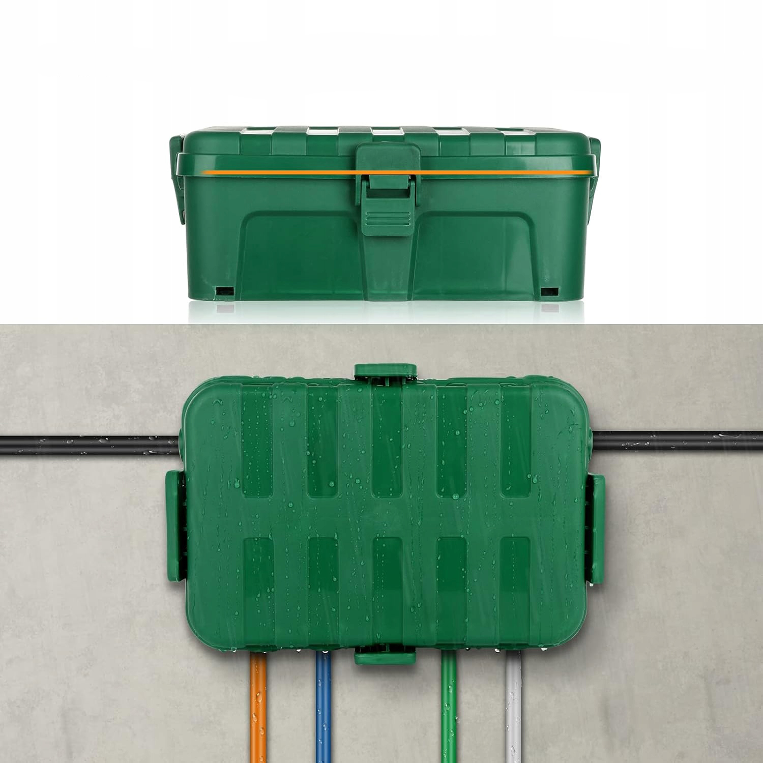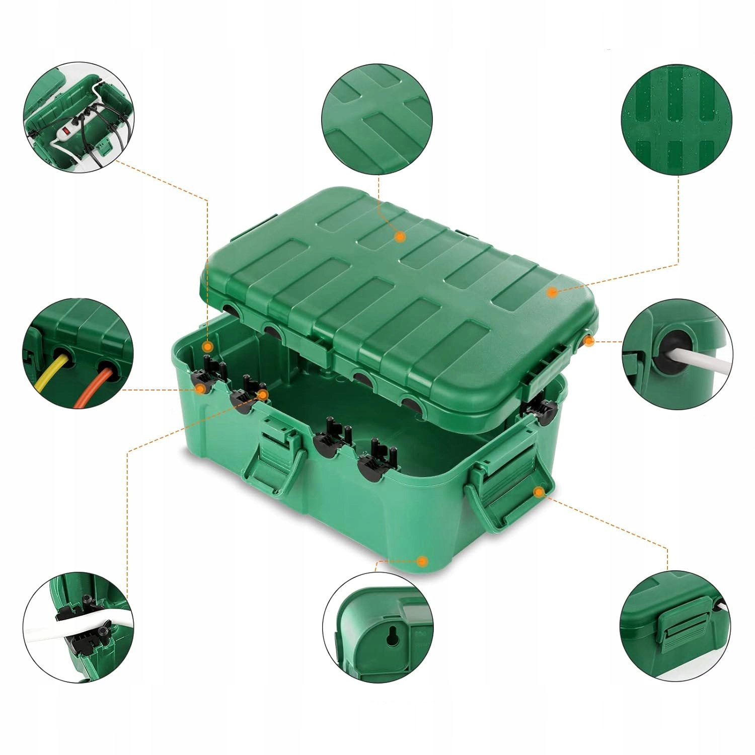 Зеленая коробка отличается прочной и прочной конструкцией. Он устойчив к повреждениям и имеет прочный корпус. Изготовлен из высококачественного пластика. Оснащен отверстиями, позволяющими вывести 6 кабелей.