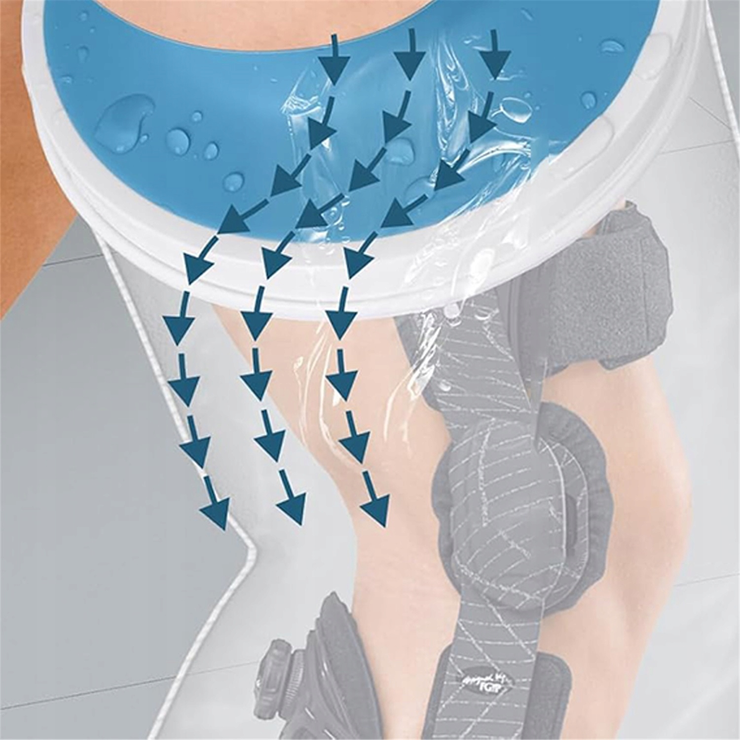 Обруч оснащен легким тонким кольцом, которое эффективно блокирует воду, создавая непроницаемый барьер на уровне колен. Благодаря этому вся нога остается сухой, что позволяет безопасно принимать душ после операции на колене или травмы.