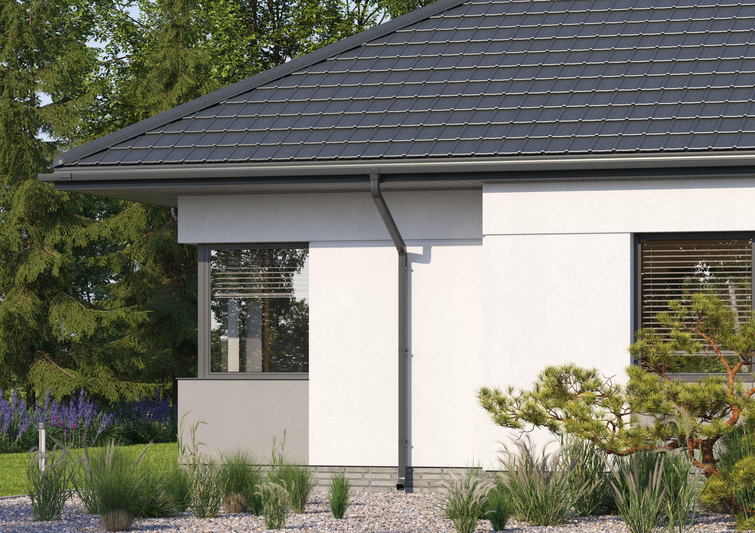 Flamingo iQ — это квадратный стальной желоб со скрытым креплением. Идеально подходит для всех типов крыш. Он идеально вписывается как в современный дизайн дома, так и в современный дизайн. современный сарай и сарай в классическом стиле.