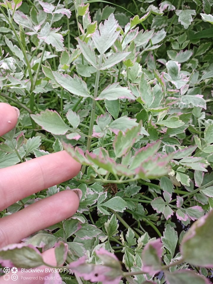 Растение с трехцветными листьями с белыми краями и розовыми пятнами. Летом появляются зонтиковидные белые цветки. Вырастает примерно до 30 см. Его можно использовать как почвопокровное растение для маскировки краев. Он быстро разрастается за счет столонов, занимая большие площади. Оптимальная глубина погружения – 0-5 см. Он также хорошо работает на влажной клумбе. Растения, растущие в тени, имеют более насыщенную окраску – на солнце цвета выгорают. Экспансивный вид требует прореживания.
